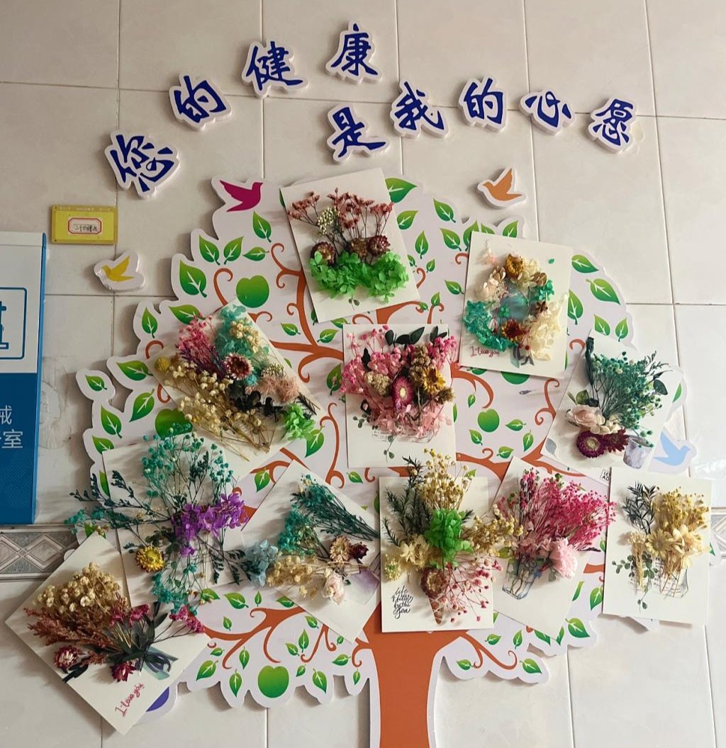 活动现场,精心布置的桌子上摆满了各种各样的干花材料,有色彩斑斓的满天星、金黄灿烂的麦穗、淡雅的薰衣草等。护士们和患者们围坐在一起,眼中都闪烁着期待的光芒。