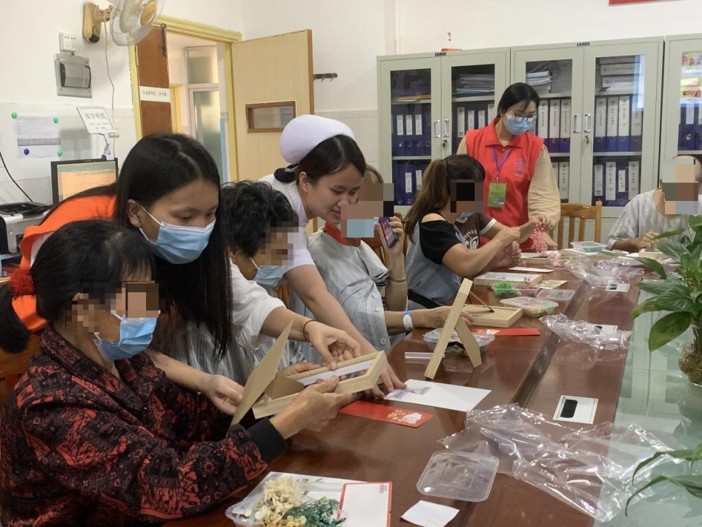 在实际操作环节,护士们和患者们携手合作,开始她们的插画创造之旅。社工部许春婷等人及护士们穿梭于患者之间,为他们贴心地帮忙递花材、剪花枝。一位年轻的患者和一位年长的患者组成了一组,护士也在旁边耐心地询问患者喜欢的颜色和花型:“阿姨,您看这多干花跟这种颜色搭一起怎么样?粉色的满天星多漂亮,我们可以多放一些,再加上几支淡紫色的薰衣草,肯定很好看。”患者阿姨笑着点头。