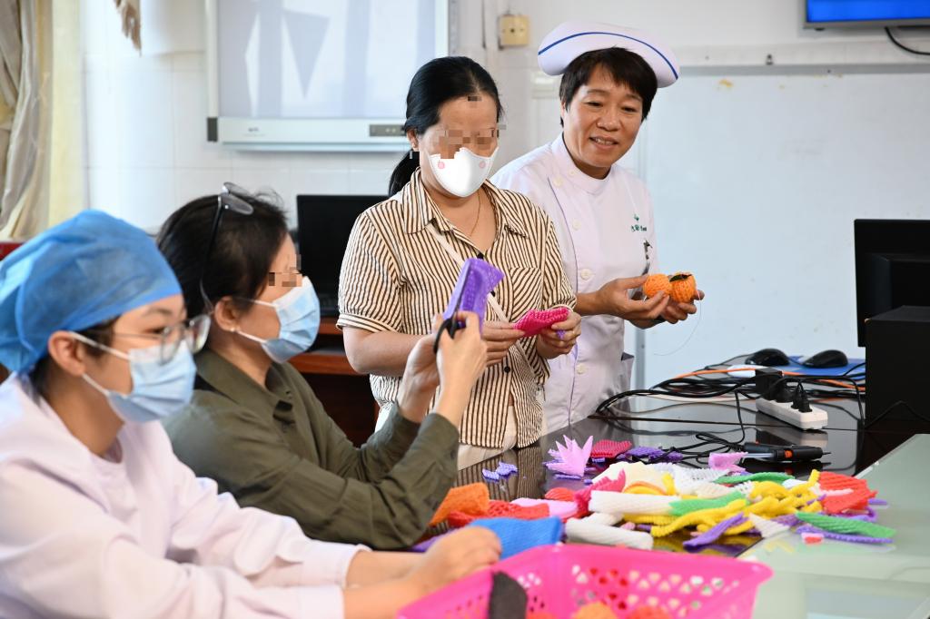 在郑春燕护士长的引导下,组织参与者围坐一起,伴着舒缓的轻音乐,一边制作手工作品,一边轮流分享自己最近遇到的压力事件和情绪困扰。有的家属制作草莓、花朵,表达会勇敢面对目前的困境;有的患者通过制作苹果,表达对康复的期望;有的患者制作金灿灿的玉米,表达对未来生活的希望。每一件作品都仿佛在诉说着他们与病魔抗争的坚韧与勇气。通过分享,帮助参与者减轻悲伤、焦虑、紧张、恐惧等情绪,让他们的情感得到宣泄与释放,学会自我关怀,勇敢地面对和处理内心的情绪,获得了身心的愉悦和健康。