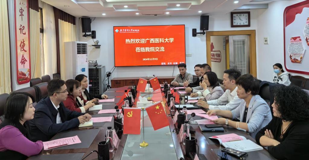 2024年12月9日,广西医科大学护理学院副院长刘媛航、学生科副科长蒋威、学生科干事覃秋萍及辅导员叶青莅临广东医科大学附属医院。广东医科大学第一临床医学院常务副院长张远起、人力资源部副部长龙晓夏、护理部部长梁霞、护理部副部长姜萍、手术与介入手术室科护士长钟一岳、急救中心护士长周健东、介入手术室护士长江维军及员工代表来自于急救中心甘日志、呼吸与危重症医学科麦显君、甲状腺乳腺外科林萍、急救中心叶柳明及颅脑创伤与肿瘤外科刁玲进行了一场别开生面的交流会。会议在行政楼三楼1号会议室进行,旨在深化护理教育与临床实践的结合,促进双方资源共享与优势互补,共同提升护理人才培养质量。
