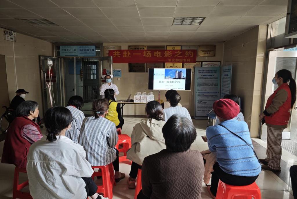 对于反复入院治疗的肿瘤患者来说,住院过程枯燥无味,容易精神压抑、疲于交流、丧失信心。为丰富患者们的病房生活、树立其正确对待疾病的信念、建立和谐的护患关系、加强医护间的沟通交流,叙事师资刘长萍于2024年12月9日下午在肿瘤大楼三楼大厅组织了一场电影之约--《心灵点滴》。