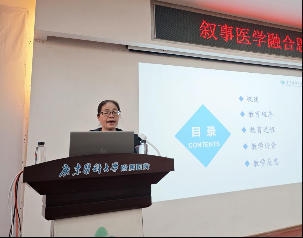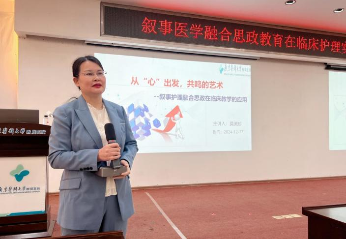 莫美珍护士长则围绕 “叙事护理联合思政在临床教学的应用” 展开精彩分享,强调了叙事医学与思政教育结合的重要性。她指出,叙事医学的核心在于探索患者个人经历和情感,与思政教育培养学生人文关怀和价值观的目标一致。莫护士长强调教师应以学生为中心,关注他们的内心感受和需求,理解学习中的困惑和挑战。她提倡建立平等、理解、信任的师生关系,创造积极的学习环境。莫护士长还提出创新的教学方法,培养学生的共情、沟通和人文关怀能力,引导学生理解患者情感,培养同理心和责任感,以提供更优质的人性化护理服务。