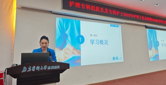 1 月 16 日下午,护理部副部长卜淑娟开场致辞,点明此次汇报会是总结汇报,也是经验交流,更是专科护理人员为谋划职业发展及提升专科影响力的实践与思考。14 名护理专科组组长和 13 名2024年学习归来的专科护士以 PPT 形式进行了汇报。汇报内容涵盖2024年工作计划的完成度、新项目新技术开展进程、专科护理人次培养、专业知识培训实施情况、学科建设成果、工作亮点与特色、科研收获、工作不足之处以及 2025 年的专科工作重点和推进措施等。