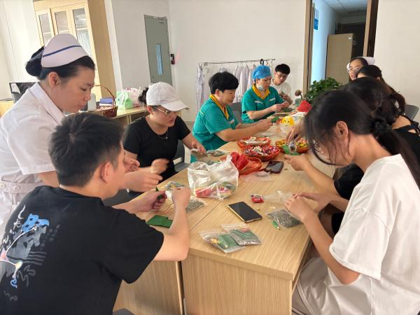 随后,进入了本次活动的核心环节——手工制作香囊。桌上摆放着制作香囊所需的各种材料,包括绿色的香囊袋、艾草以及装饰配件。叙事师资杜炜莹耐心地指导大家如何填充香料、缝制香囊等。大家认真学习,积极动手,不一会儿,一个个精致小巧、散发着阵阵艾香的香囊便在手中诞生。患者及家属们纷纷展示自己的成果,脸上洋溢着喜悦与自豪。此刻,香囊不再仅仅是节日饰物,它凝结了制作者的专注时光,承载着他们对健康、对团圆、对美好生活的期盼与憧憬。大家互相展示、交流心得,小小的香囊成为分享个人故事、联结彼此情感的媒介,科室里回荡着欢声笑语,也流淌着无声的理解与支持。