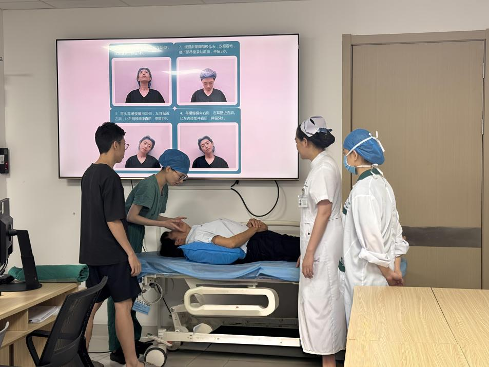 根据术后回访反馈,我们发现许多术后患者会出现甲状腺体位综合征的情况。为了预防甲状腺体位综合征,手术室团队查阅相关文献指南,通过术前有效地体位锻炼,指导患者提前适应术中体位,帮助患者减少术后颈肩酸痛等不适。因此我们特别增设了‘手术体位训练’环节。当手术室护士黎婷以温暖而充满力量的声音发出邀请:"有哪位患者想要来尝试一下吗?"现场立刻响起此起彼伏的回应声。"我这里、我这里……"一位患者和家属率先举手,眼神中闪烁着跃跃欲试的光芒。在专业的指导下,他们亲身体验了头(颈)后仰卧位,并通过科学的放松技巧学习,将"未知的恐惧"转化为"可控的体验"。在培训结束后,这位参与活动的患者及其家属表示表示:“通过这次宣教,我对手术流程有了更清晰的了解,护士们的耐心解答让我放下了心中的顾虑,感觉非常温暖。”