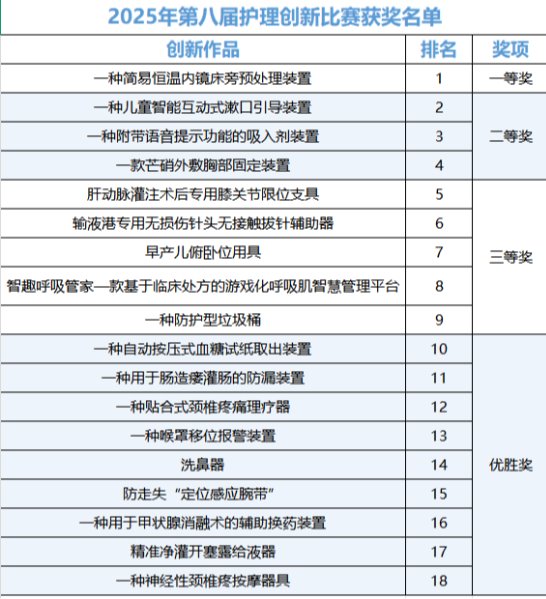 大赛征集到56项作品,18个项目进入决赛,聚焦护理用具创新、患者安全监测、智能与专科护理三大领域。“自动按压式血糖试纸取出装置”“简易恒温内镜床旁预处理装置”等优化设计,提升效率,降低感染风险;“防走失定位感应腕带”“喉罩移位报警装置”依托监测报警系统,保障患者安全。智能护理中,“智趣呼吸管家”融合游戏化训练,“贴合式颈椎疼痛理疗器”提供精准理疗,可满足多样化护理需求。
