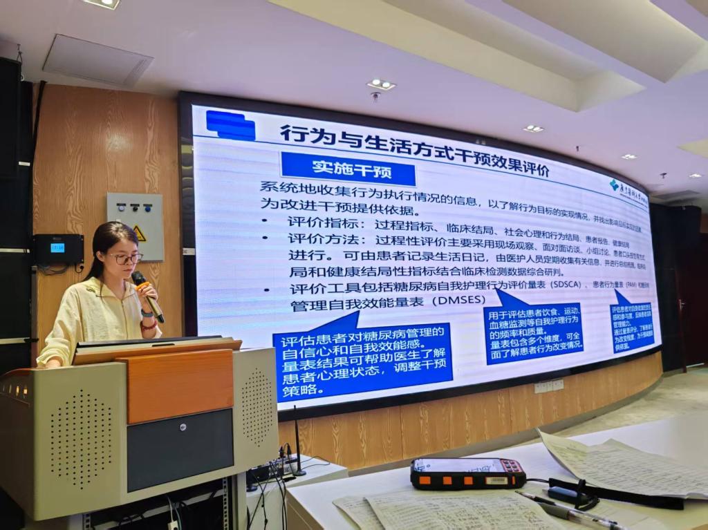 曾梅芳糖尿病足专科护士则聚焦实操,采用案例教学法,以一位典型的肥胖2型糖尿病患者“王先生”为例,全程演示了个体化干预方案的制定:从精准评估与目标设定,到掌握食物交换份法制定个性化食谱,再到运动处方的具体拟定,涵盖有氧与抗阻训练频率、强度及日常活动细节。此外,课程还涉及睡眠、戒烟、减重与心理支持等多维管理的实操策略,全面提升联络员的综合干预能力。