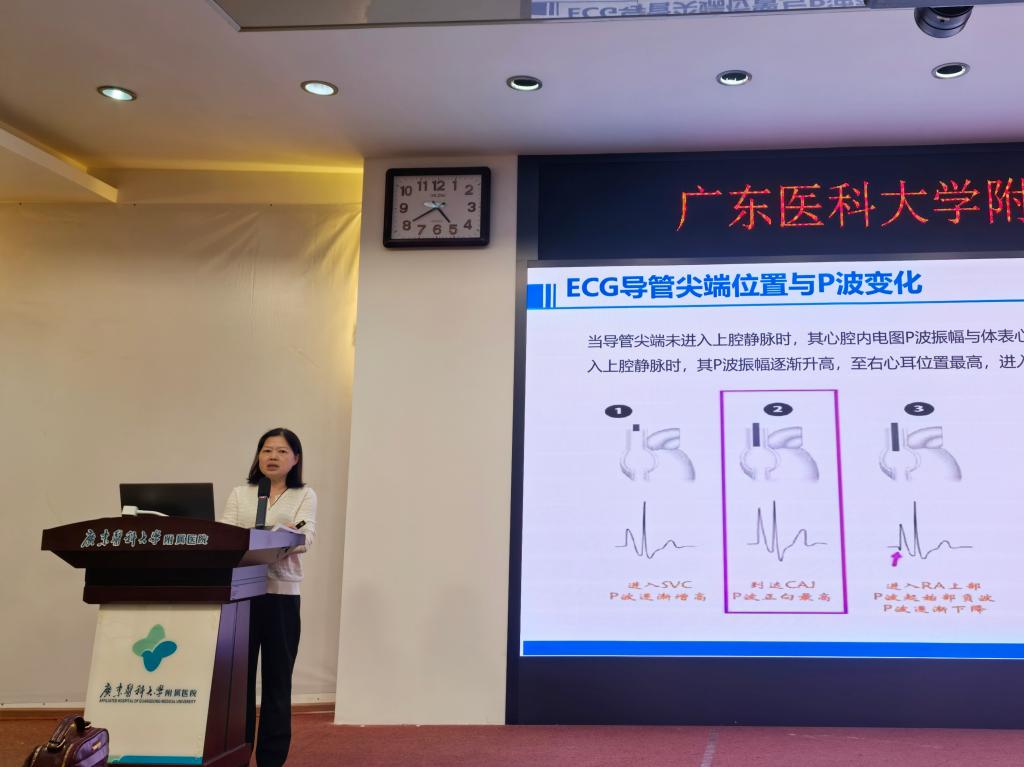 培训中,郑婉婷老师围绕上臂完全植入式输液港(上臂港)的临床应用,系统讲解了ECG(心电图)定位技术的原理、适应症与禁忌证、标准操作流程、常见问题处理及典型案例分析。她结合国内外最新指南与临床实践,详细阐述了如何通过腔内心电图实时精准引导导管尖端定位,从而有效规避异位、血栓等并发症,切实提高置管成功率,保障患者安全。