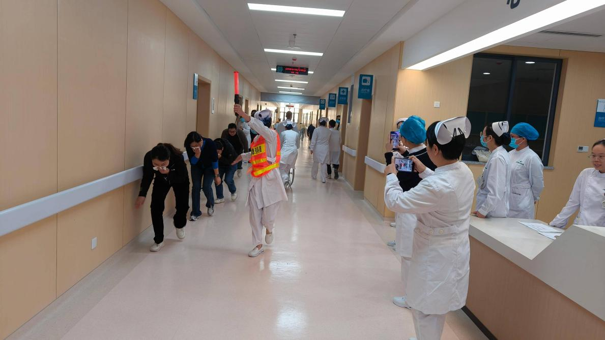 第三场住院病房火灾应急演练,模拟病房发生火情,医护人员第一时间启动应急预案,迅速组织患者沿安全通道疏散,同步完成报警和初期火灾扑救,整个过程分工明确、疏散有序。