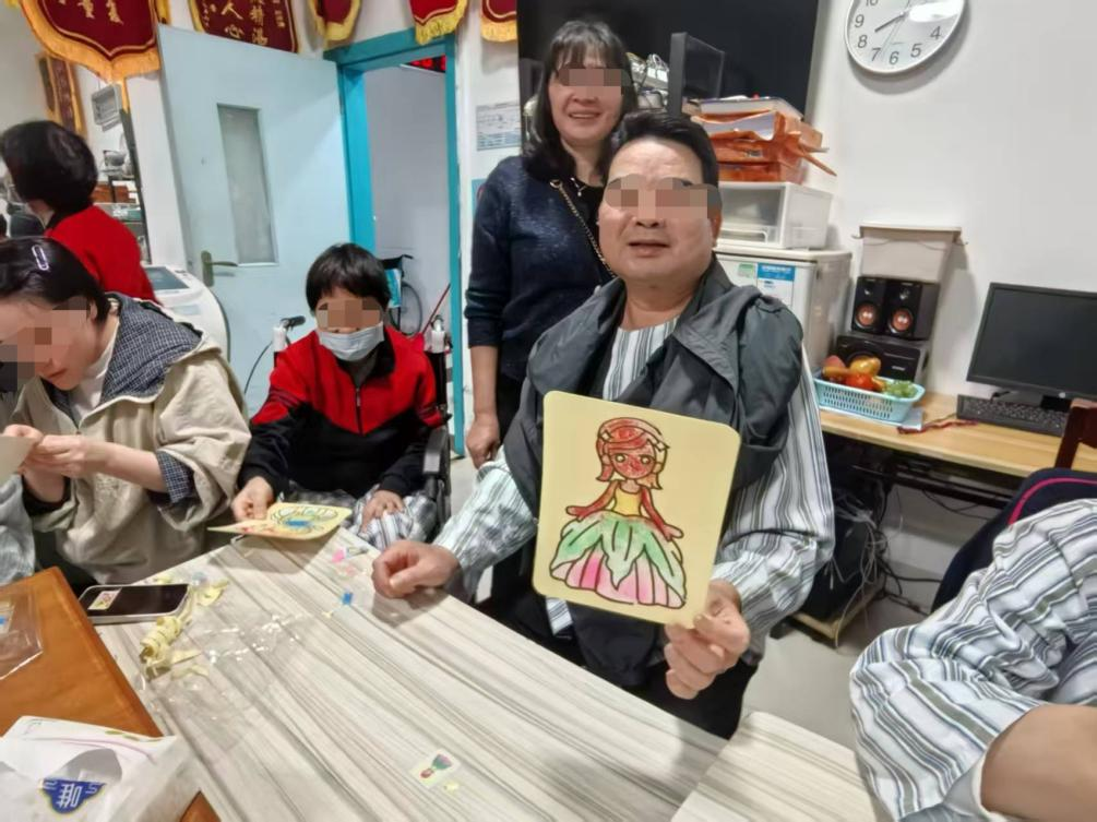 活动开始,叙事护理师资邹小雪以温和的语调轻轻引导:“今天我们一起来做沙画,大家可以按照自己的心意,选择喜欢的图案。”因脑梗后语言功能受损的王老师,目光缓缓掠过一幅幅画板,最终轻轻落在一张绘有小女孩的图案上。邹小雪护师细心为他调整好床桌,将沙画固定妥当。王老师用尚能活动的右手,小心揭开第一处胶纸。“王老师,想给这件小衣服选什么颜色呢?”小邹捧着色沙盒轻声问道。他指了指明快的黄色,随后全神贯注地看着沙粒从指缝间洒落,徐徐铺满女孩的衣襟。当那一抹鲜亮完整呈现时,他的嘴角微微扬起--这是这一周以来,他第一次露出笑容。