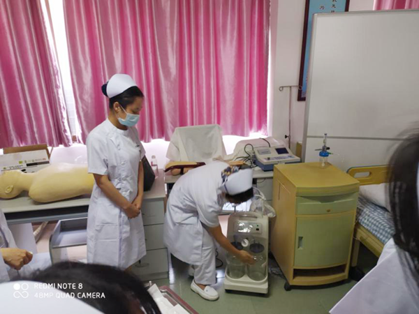 本次培训共分为七个小组,每一组由一位带教老师负责指导教学,一位老师充当标准化病人。采用真人模拟标准化病人的方式,设置一个“淋雨后咳嗽、伴呼吸困难”的案例情境进行讨论学习,第二组由杨琼碧老师指导,杨老师围绕病情观察、临床判断、人文关怀、健康指导、负压吸痰器的使用五个方面向组员们详细讲解吸痰操作,涉及的护理操作包括听诊痰鸣音、翻身叩背、有效咳嗽、经口鼻腔吸痰等,讲解结束后,组员纷纷上前练习,老师在一旁对组员的不规范操作进行纠正、指导。一位组员在进行口腔吸痰操作时,突然发现吸痰管内可见淡红色分泌物,病人表情紧张、惊慌失措,组员一时未想到应对措施,不知如何进行下一步护理操作,最后在老师指导下,逐渐冷静下来,想到应对措施完成整个操作。借此事件,老师和大家重点讲解吸痰过程中发生紧急情况时的处理,不仅给组员们留下深刻印象,也促进组员们临床应变能力的提高。经过一个下午的练习与指导,组员们基本上都能掌握吸痰法的注意事项及紧急情况处理,并且能够准确的将护理技能操作融入到创设的情景中。