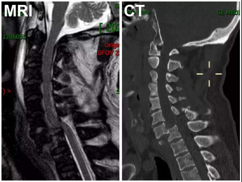 图1、患者入院时的MRI及CT检查显示:C7椎体完全脱位,相应节段脊髓未见明显卡压