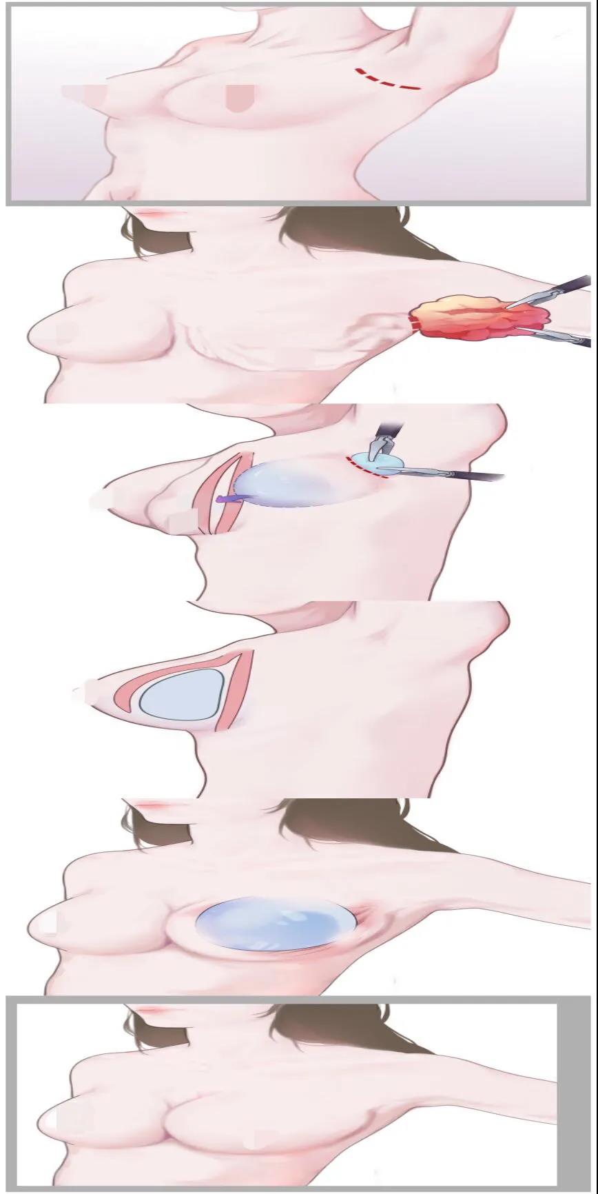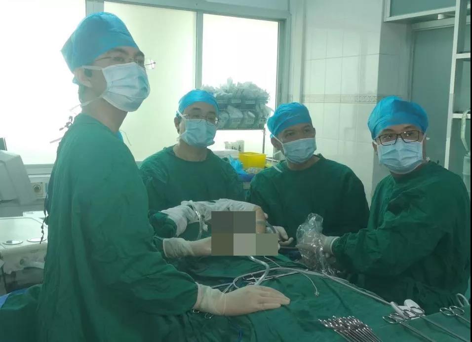 在征得患者同意后,张远起副院长与李建文教授带领科室骨干副主任医师黄胜超施行手术——在患者腋下隐蔽处取一长约4cm的切口,经单孔腔镜为该患者进行腔切除左乳皮下腺体组织,同期利用“双平面”法在胸大肌后植入假体,并在腔镜下完成胸外侧自体筋膜的分离对假体进行覆盖。