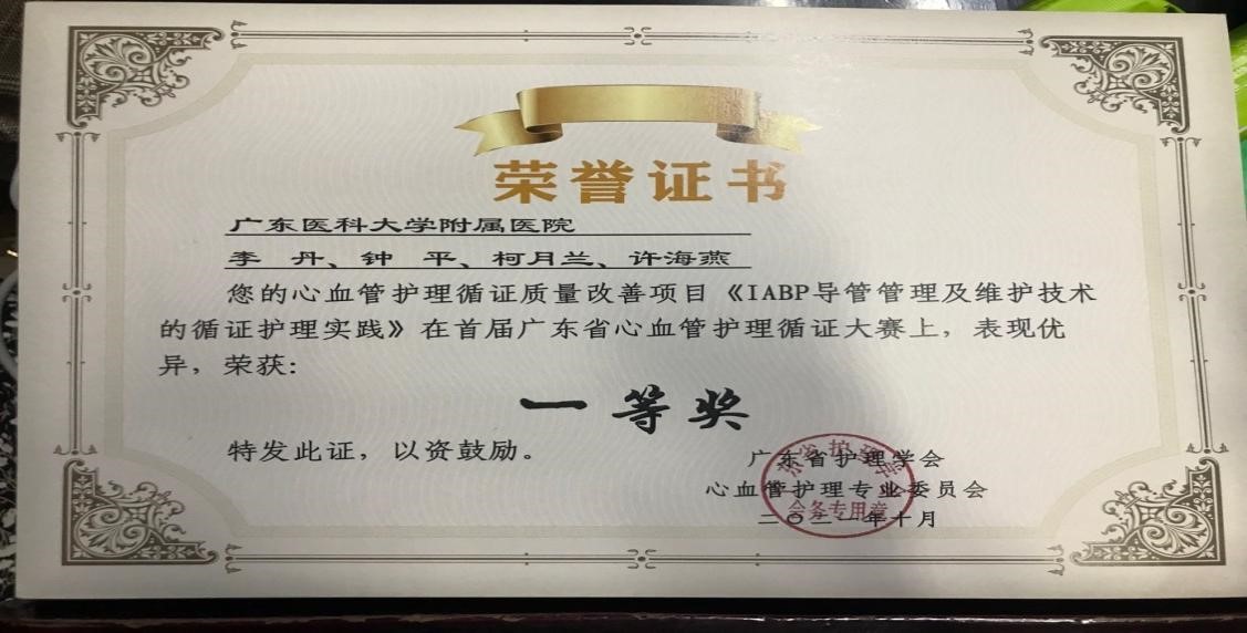 10月16日,由广东省护理学会心血管护理专业委员会举办的“心血管疾病护理新进展研讨班”暨首届“心血管护理循证质量改善项目”比赛在广州召开。 我院冠心病专科以《IABP导管管理及维护技术的循证护理实践》为循证质量改善项目主题参赛并荣获一等奖。