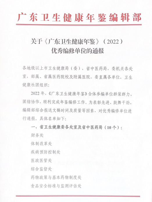 3月23日,广东省卫健委组织的2022年度《广东卫生健康年鉴》编修培训班在广州举行。会上,我院获评为《广东卫生健康年鉴》(2022)优秀编修单位,全省部属、省属医药院校及附属医院中仅13个单位获此荣誉。