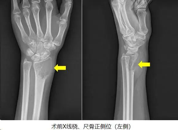 21岁的小英,一个多月前突然感觉自己左腕关节出现间断性疼痛,初期以为是运动时不小心扭伤,随着时间推移,她发现左手腕处居然长了一个质硬的包块,并到医院拍片后,发现左侧桡骨远端膨胀溶骨性破坏。随后曾到广州某三甲医院就诊,经过多番打听和比较后,选择来到我院骨质疏松与骨病骨肿瘤科外科门诊找到郑鸿主任就诊。