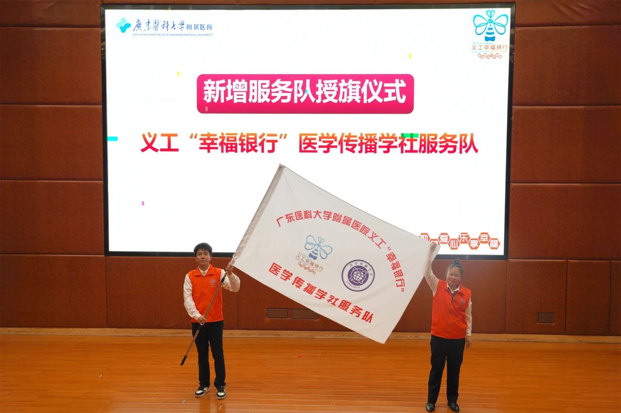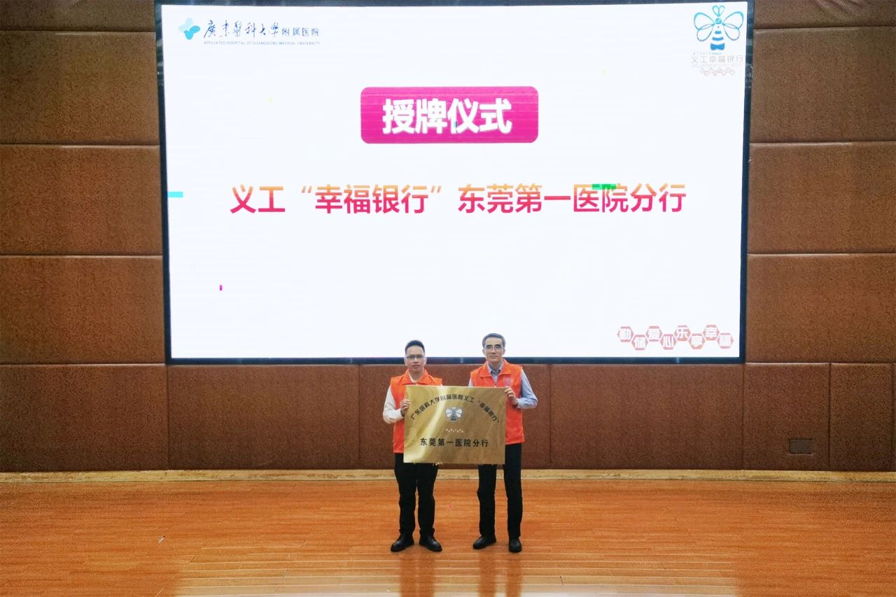 与会领导、嘉宾为新增的义工“幸福银行”医学传播学社服务队、义工“幸福银行”爱耳在路上志愿服务队授队旗,为义工“幸福银行”东莞第一医院分行授牌。