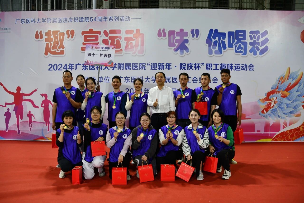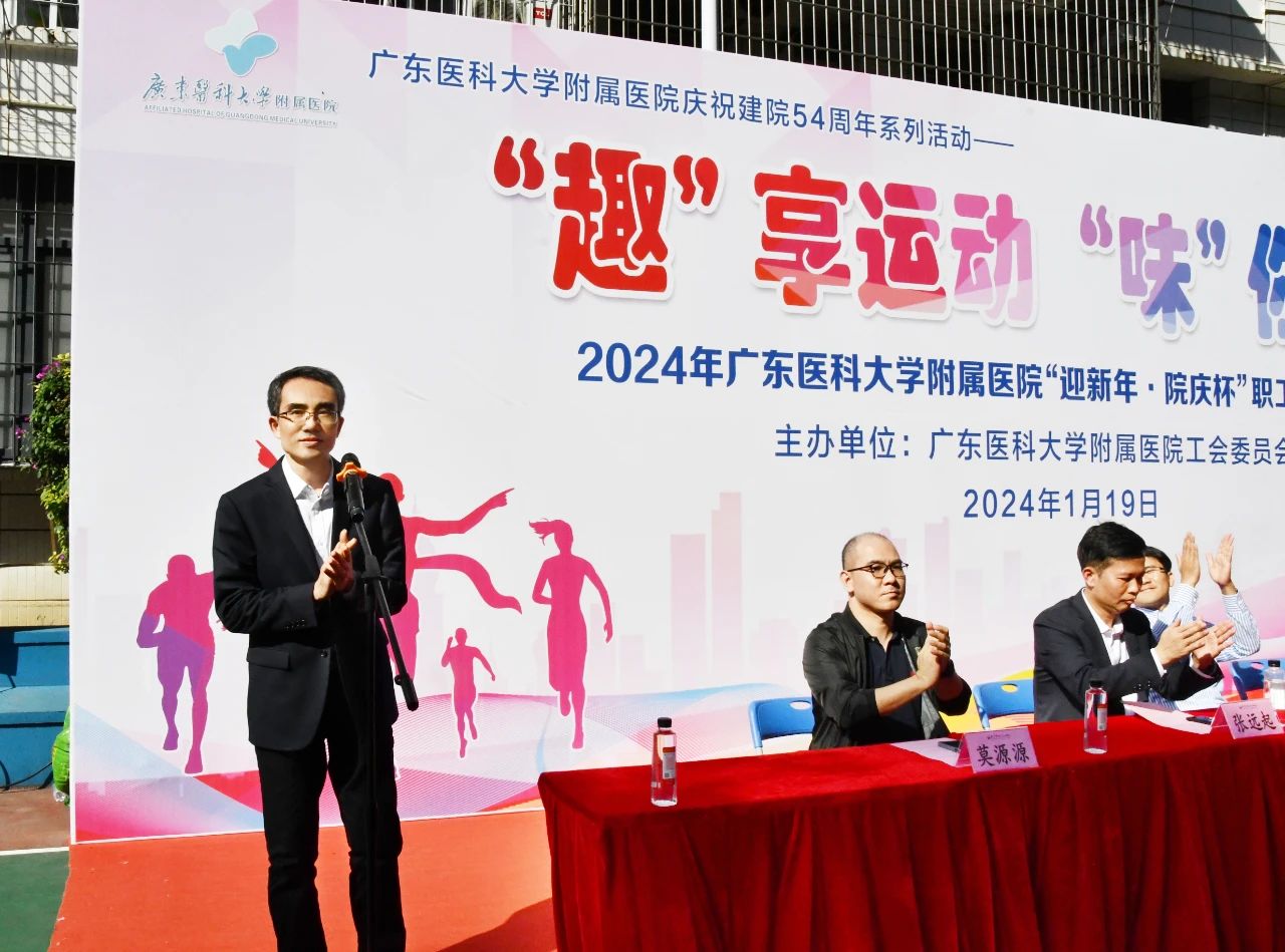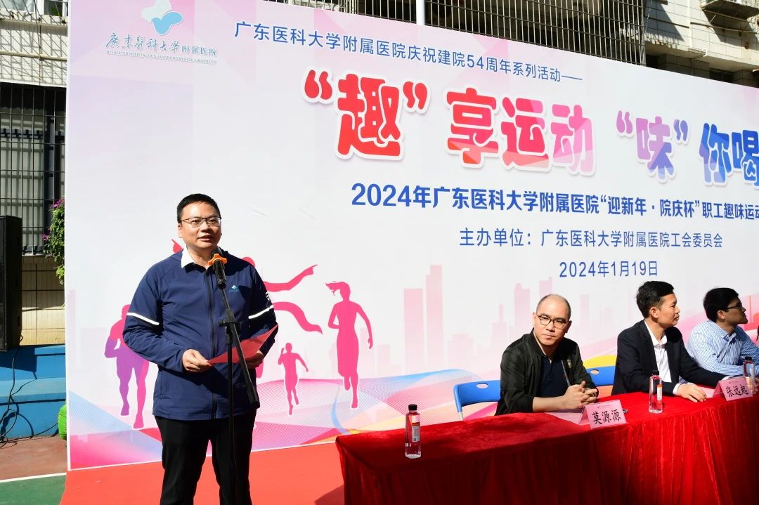 随后,医院党委书记蔡定彬现场宣布:“广东医科大学附属医院庆祝建院54周年系列活动之2024年‘迎新年·院庆杯’职工趣味运动会开幕!”