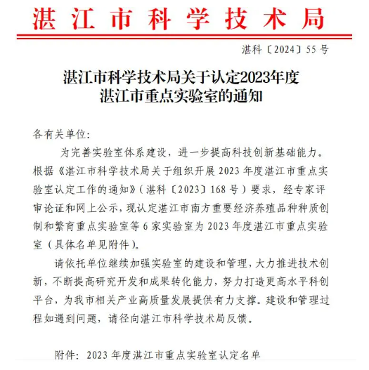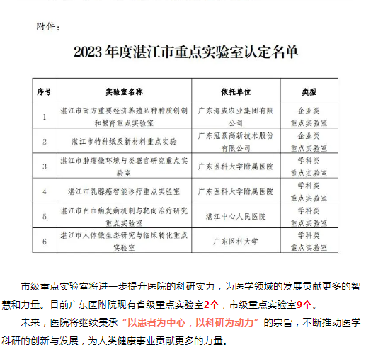 近日,广东医附院血管甲状腺乳腺外科“湛江市乳腺癌智能诊疗重点实验室”肺部肿瘤专科“湛江市肿瘤微环境与类器官研究重点实验室”成功列入市级重点实验室建设名单,是此次申报中唯一两个重点实验室同时被列入建设名单的单位。