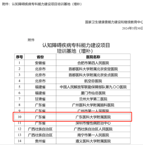 为加强认知障碍疾病的专科能力建设,提升医疗服务质量,国家卫生健康委能力建设和继续教育中心于2024年1月启动了增补认知障碍疾病专科能力建设项目培训基地的工作。经层层筛选,我院凭借强大的专业能力、优秀的师资团队、丰富的培训经验以及对区域培训需求的深入了解,成功入选,成为广东省的五家培训基地之一。