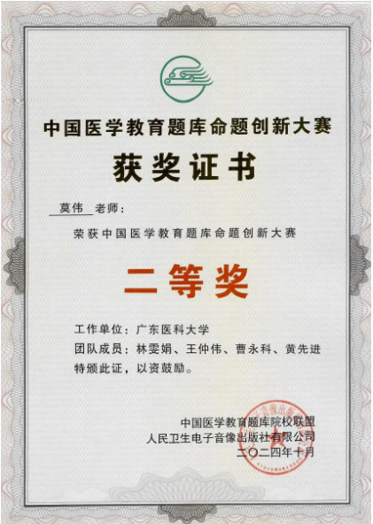 10月26日—29日,首届中国医学教育题库命题创新大赛在辽宁沈阳举行,广东医科大学党委常委、副校长曾志嵘带队参赛,广东医科大学第一临床医学院外科系莫伟主任医师团队荣获二等奖。