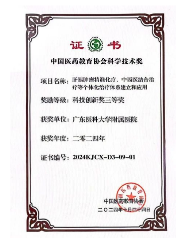 2024年11月1日至3日,中国医药教育协会第二届科学技术发展大会在北京西国贸大酒店召开,梁启廉教授研究团队以医院作为独立单位申报的研究成果《肝胰肿瘤精准化疗、中西医结合治疗等个体化治疗体系建立和应用》荣获2024年度中国医药教育协会科技创新奖三等奖。