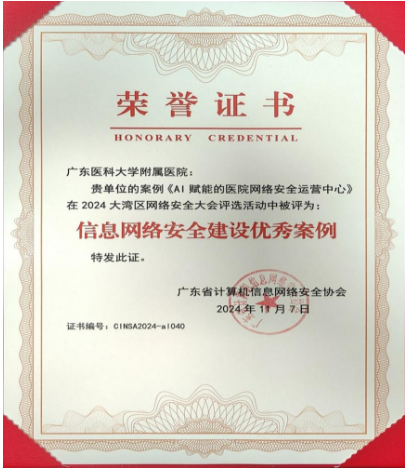 2024年11月,由中共广东省委网络安全和信息化委员会办公室、广东省公安厅、广东省政务服务和数据管理局、广东省卫生健康委员会、广东省教育厅指导,广东省计算机信息网络安全协会主办的“2024大湾区网络安全大会”在广州市长隆国际会展中心顺利召开,本次会议围绕“共筑网络安全防线,护航大湾区数字未来”为主题,重点聚焦于医疗、教育等民生关键行业,深入分析在数字化转型过程中面临的网络安全挑战与机遇,同时在大会中开展“信息网络安全建设优秀案例”、“2024大湾区网络安全优秀论文”、“湾区网络安全优秀人才”等三项评选活动。来自全省各条战线的优秀信息化建设团队在评选中百花争鸣,各显神通,勇争荣誉,广东医科大学附属医院信息技术部部长黄泽光带领我院技术团队突围而出,拔得头筹,在三项评比活动皆有斩获,成为获奖最多的团队之一!