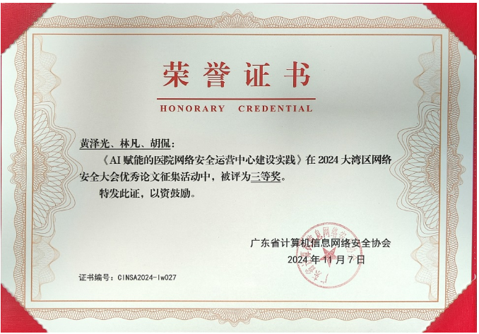 在“2024大湾区网络安全优秀论文”评比活动中,由信息技术部黄泽光部长、安全组林凡组长与集成组胡侃组长带领团队编写的《AI赋能的医院网络安全运营中心建设实践》论文喜获三等奖,论文详细介绍了黄泽光部长近年以AI赋能的网络安全运营的技术创新及特点,逐步构建以AI大模型为引擎驱动,通过自定义模型微调,结合组织制度流程、自动化响应与编排技术(SOAR),实现场景化的安全理解、检测、响应、和处置能力的安全运营体系。同时通过结合线上安全专家7*24值守和本地运营团队的持续运营保障机制,从人工被动运营体系向实战化、智能化的“主动运营”转变,实现“自主响应闭环,持续安全运营”的运营效果,以满足我院信息建设过程中对安全保障不断提升的要求。
