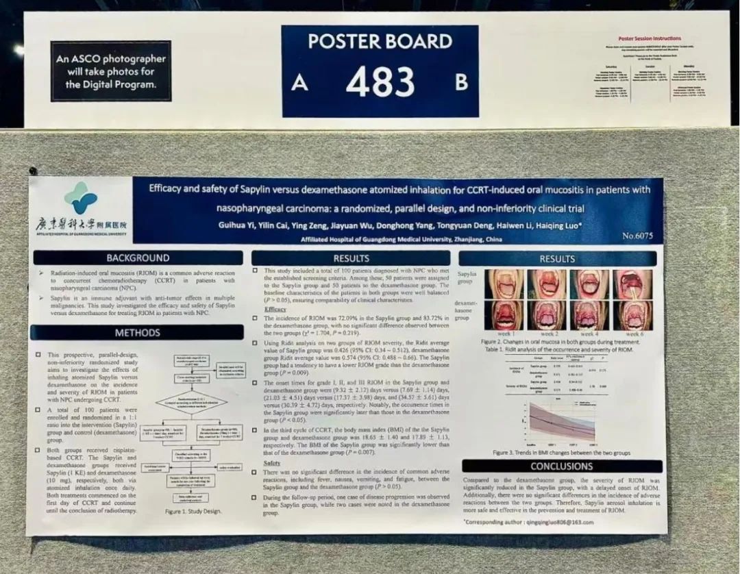 《沙培林对比地塞米松雾化吸入治疗鼻咽癌患者放射性口腔黏膜炎的疗效和安全性:一项随机、平行设计、非劣效性临床试验》(Poster 6075)英文题目:Efficacy and safety of Sapylin versus dexamethasone atomized inhalation for CCRT-induced oral mucositis in patients with nasopharyngeal carcinoma: a randomized, parallel design, and non-inferiority clinical trial.