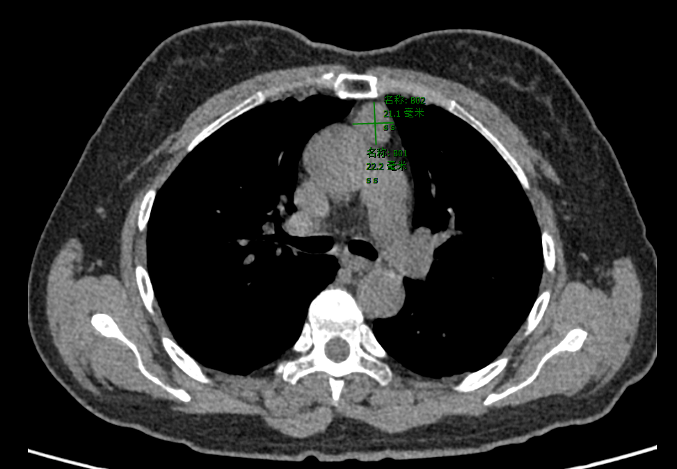 患者因胸部CT检查发现纵隔肿物,到广东医附院胸外科做进一步诊治。入院后进行了各项术前相关检查,患者心肺肝肾等功能良好,无高血压、糖尿病等基础病。纵隔肿物考虑胸腺瘤可能性大,经患者家属同意以及胸外科术前讨论后,胸外科医师团队选择达芬奇机器人辅助经剑突下入路切除纵隔肿物。
