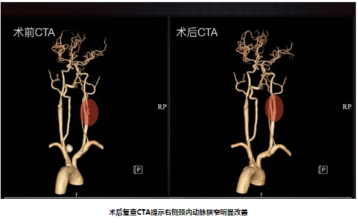 64岁男性,因“反复头晕3月”入院,既往有“脑梗死、高血压病、糖尿病”史。入院后完善颈动脉彩超及影像学检查提示:双侧颈内动脉开口重度狭窄。经颈动脉狭窄MDT团队充分讨论,结合斑块性质及患者临床需求,脑血管外科团队予患者行右侧颈动脉内膜剥脱术。术后第二天患者即能下床,术后3天复查CTA提示颈动脉狭窄得到明显改善。
