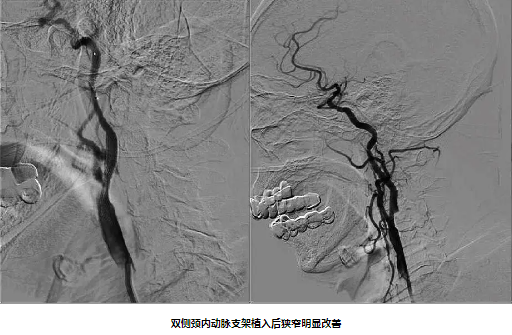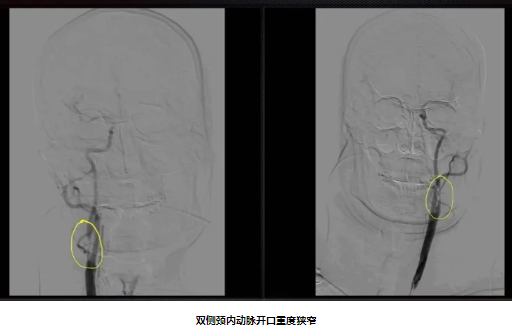 82岁男性,因“双下肢无力10天”入院,既往有“高血压病”史10年。入院后完善颈动脉彩超及影像学检查提示:1.分水岭梗死(双侧皮质下型)2.双侧颈内动脉重度狭窄 3.窦性心动过缓。经颈动脉狭窄MDT团队充分讨论,精心安排,在心血管内科中心的协助下,脑血管病专科团队克服了患者高龄、心动过缓等危险因素,成功给予患者双侧颈动脉支架同期植入,患者症状得到明显好转。