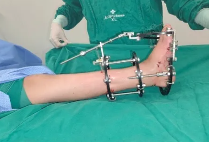 近日,我院创伤骨科在吴浩俊主任医师的带领下,由陈继铭、刘田丰、陈周韬、潘开翔等组成的足踝医师技术团队,在麻醉手术中心、创伤骨科护理团队的共同努力下,成功为1名脑瘫后马蹄内翻足畸形患者成功实施了 ilizarov环形外固定架矫形手术。