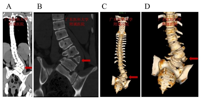 术前脊柱CT:L4呈楔形半椎体畸形,腰弯以L4半椎体为顶锥明显向左侧凸