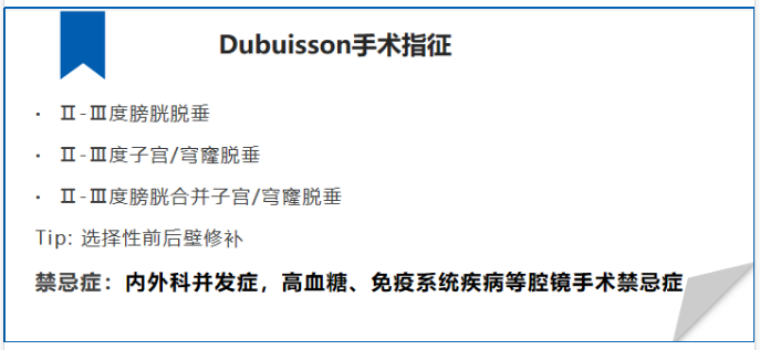 Dubuisson手术是可在保留子宫或不保留子宫下进行,可运用于性生活频繁和超重妇女群体的POP治疗中,可减少潜在的严重并发症。