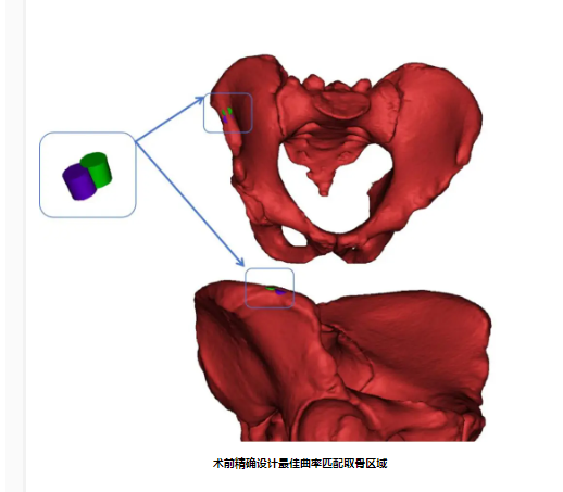 然而,术前影像学资料显示,患者距骨病灶的位置靠近踝关节后内侧,常规的内踝纵行截骨难以获得良好的暴露及骨移植操作空间,给手术增加了较大的难度。此外,该术式要求术者对病灶形态精确评估和规划,在移植过程中因移植物和缺损病灶在曲率形态上的失匹配将导致移植术后发生中晚期的创伤性关节炎。对此,团队的欧阳汉斌博士后与黄华军博士后决定采用数字骨科技术,最终确定髂骨的最佳供区。