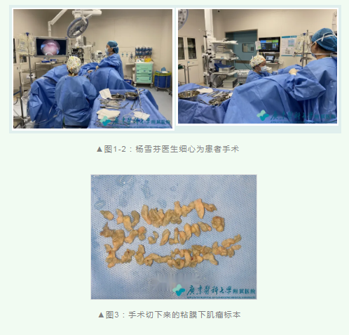 入院后完善相关检查,患者血红蛋白67g/L,我院妇科专科超声(经直肠)提示:子宫大小正常,见右前壁大部分突向宫腔低回声19mm×15mm,29×20mm相互融合,考虑粘膜下肌瘤可能。双附件未见明显异常包块。初步诊断为:子宫粘膜下肌瘤、中度贫血。经过评估,杨雪芬医生建议给小桑进行宫腔镜检查+子宫粘膜下肌瘤旋切术(又称宫腔镜下组织去除,HTRS)备电切术。