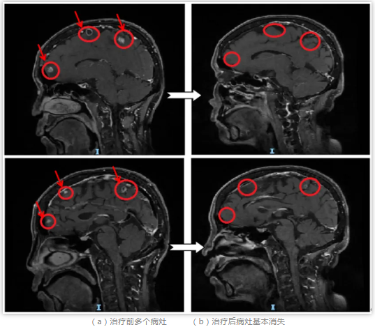 王女士最近很苦“脑”,发现肺部肿瘤复发转移到了脑部,新发病灶多达6颗。为提高放疗疗效、减少放射损伤,肿瘤科团队提出采用新近开展的 “多靶点精准放射治疗技术(MTPRT)”进行治疗。相较于全脑放疗而言,该技术不容易脱靶,能够更有效保护靶区外的正常脑组织,降低患者的副反应。