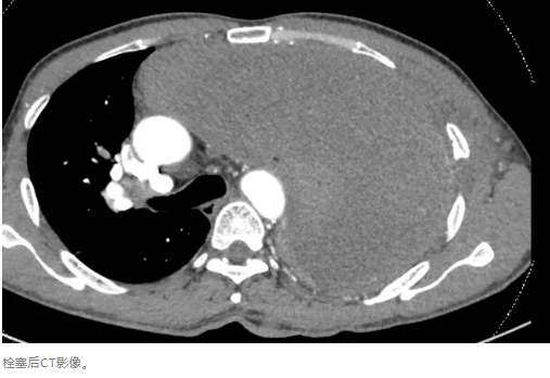 4、最后也是最重要的,于2024年9月14日在介入科主导下行肿瘤相关滋养血管栓塞治疗,治疗后复查胸部增强CT对比,见肿瘤血运明显减少。