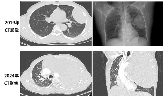 治疗前背景:患者黄某某,男性,56岁,2019年时因活动后气促行CT检查发现左侧胸腔内有一肿物影,大小约5cm*5cm*3cm,考虑良性肿瘤。当时未予重视,未行进一步检查及治疗。近年来,患者活动后气促逐渐加重,直到2024年5月再次就诊,行CT检查提示左侧胸腔肿物明显增大,约30cm*25cm*25cm,巨大的肿瘤几乎占据了整个左侧胸腔,并严重挤压纵隔、气管、心脏,导致以上重要器官出现明显移位。