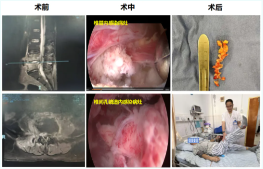 技术特点:该患者腰椎术后感染,感染范围涉及椎管内及右侧腰背肌,合并脓肿形成。传统开放清创手术切口大,剥离肌肉范围大,对镜道清理困难,而患者反复高热,免疫力低下,身体情况较差,开放大手术风险高。团队使用UBE技术微创剥离下大量水介质不但可以冲洗术野,也可以清晰分辨神经组织及感染病灶组织,椎管内彻底清创同时镜下对前次右侧椎间孔镜镜道进行冲洗及清创。术后第二天患者无发热,腰痛及右下肢疼痛明显缓解,感染指标明显下降。