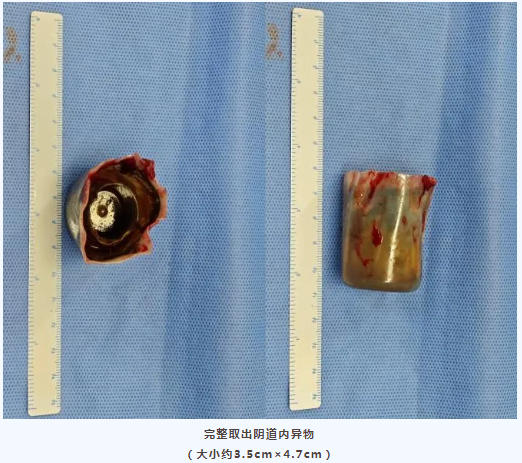 术中发现,由于异物潜藏阴道时间过长已造成慢性炎症,月月的阴道已经被大片的肉芽组织封闭,仅有一小孔与外界相通,根本无法直接取出异物。宫腔镜经小孔进入阴道内可见异物表面布满厚重脓苔,并与阴道壁完全融合,手术难度极大。面对这样棘手的情况,符爱珍主任医师果断采取开放式阴式手术,逐步切开肉芽组织,仔细分离异物,最终成功将异物完整取出,检查膀胱、尿道和直肠均无损伤。