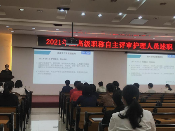 根据省人力资源社会保障厅《关于做好2021年度职称评审工作的通知》(粤人社发〔2021〕38号)和《广东医科大学附属医院卫生健康专业技术人才职称评价标准(试行)》要求,为做好我院2021年度卫生健康专业技术人才职称评审工作,2022年11月3日下午高级职称自主评审护理人员述职会议在学术报告厅召开。护理部部长、副部长、科护士长、病区护士长及骨干代表出席本次评审会议。评委严格按照标准对申报人员的基本条件、医德医风、临床工作能力、科研能力、业绩成果等方面进行审核。