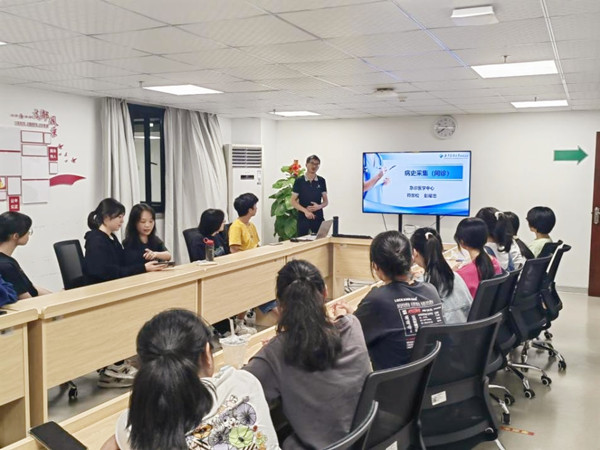 急诊医学中心护士长符景松为同学们讲解了标准化病人的培训和准入,语言诙谐幽默,风趣十足,让同学们对标准化病人有了初步的认识及兴趣。急诊医学中心灾害专科护士彭耀忠主管护师为同学们带来“病史采集(问诊)”一课,从理论到实践,结合专业课程知识,讲授何为问诊以及如何通过技巧表达病例,做一名合格优秀的标准化病人。