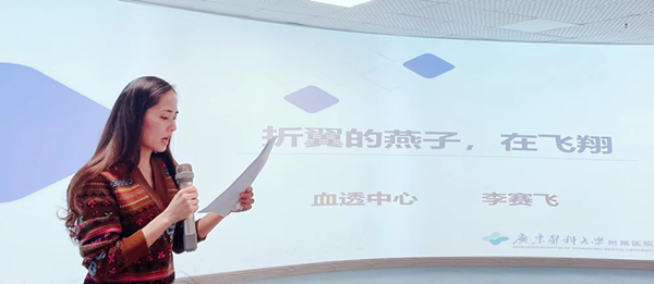 李赛飞富有情感的朗诵着:“在这个城市有着这么一群人,他们一周要来医院两三趟,风雨无阻,他们就是尿毒症患者,这个城市的“血透军”,其中有位“血透军”王燕子身上的那股不肯向命运低头的劲,感染着她身边的人,也正是这种内在韧性,让她最初收获了爱情,到拥有一个幸福的三口之家,工作上也取得不错的成绩,把自己的日子打理得有声有色,生活充满了乐观和希望。