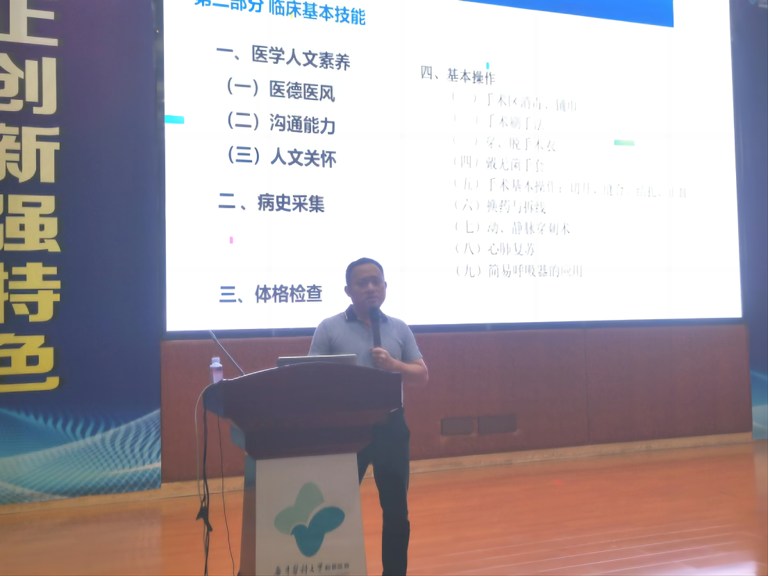 为了进一步提高我院本科医学生的临床技能基本操作,以夯实基础,提升技能为目的,精进临床技能操作水平,2023年7月31日晚,教学部邀请技能中心陈继铭副主任在全科楼15楼会议室为同学们作2023年本科医学生临床技能培训讲座,教学部杨永恒老师主持,广东医科大学在附院实习的241位学生参加了讲座。