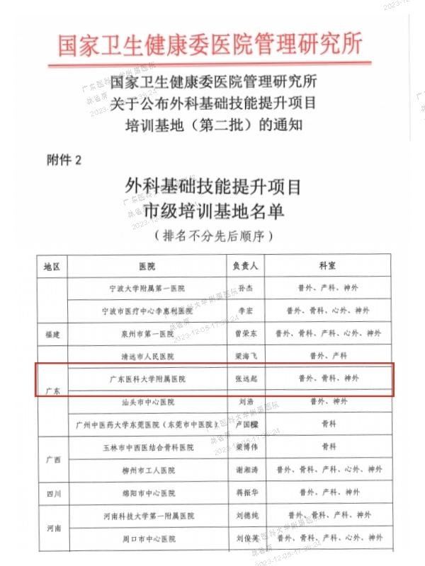 近日,国家卫生健康委医院管理研究所发布了《关于公布外科基础技能提升项目培训基地(第二批)的通知》,我院成功入选第二批外科基础技能提升项目市级培训基地,医院党委委员、副院长张远起任培训基地负责人,其中普外科、骨科、神经外科专业通过全国遴选,获批培训资质!