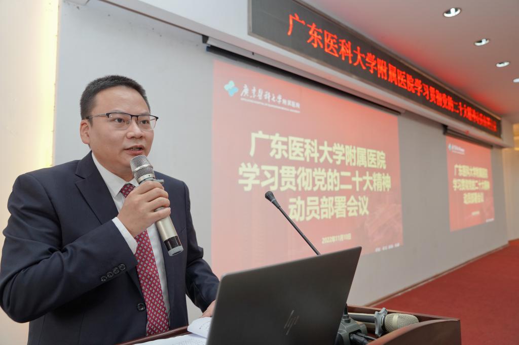 11月10日,广东医科大学附属医院召开学习贯彻党的二十大精神动员部署会议。党委书记李明意作题为《深入学习贯彻党的二十大精神 团结奋斗加快省级区域医疗中心建设》的动员部署讲话,院领导班子、党委委员、纪委委员及部分中层干部、党支部书记等参加会议。