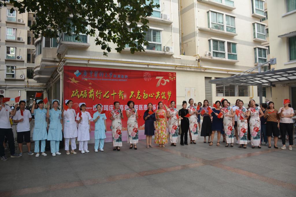 下午,老年病区小广场的活动,吸引了不少患者及家属参与,独唱《我的中国心》、诗朗诵《岁岁重阳,今又重阳》、旗袍秀《水姻缘》、古筝演奏《山丹丹花开红艳艳》、舞台秀《中国我爱你》等表演,感染了现场所有人。激动人心的大合唱《我和我的祖国》,为活动画上圆满的句号。