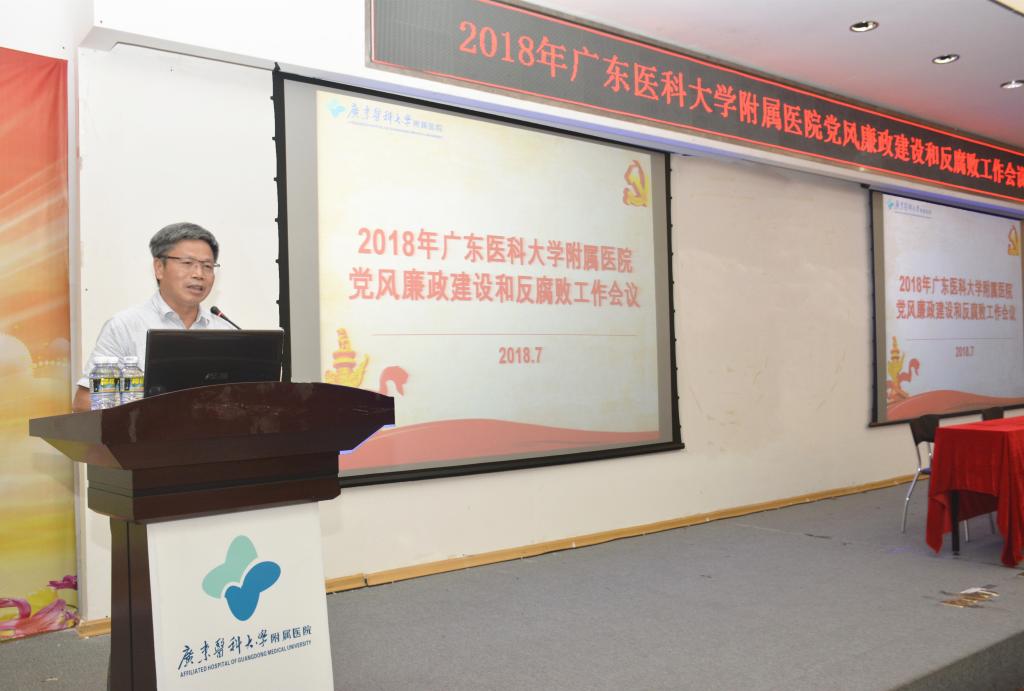 学校党委副书记、纪委书记符学三在会上了重要讲话,指出会议召开得很及时,也很有必要,并代表学校党委、纪委,对医院工作提出三点要求:进一步增强党风廉政建设和反腐败斗争的政治自觉,附院党委进一步强化党风廉政建设和反腐败工作的主体责任,附院纪委进一步强化党风廉政建设和反腐败工作的监督责任。他指出,当前反腐败斗争压倒性态势已经形成并巩固发展,反腐败斗争形势依然严峻复杂,医疗卫生行业依然是腐败问题的易发多发领域。他希望同志们能够积极投入到党风廉政建设和反腐败工作,遵纪守法,群策群力,在附院获批省内首批9家“登峰计划”重点建设医院的新的历史机遇期,力促医院各项工作更上新台阶,为学校建设高水平医科大学和建设健康湛江、健康广东作出新的更大贡献。符书记还强调,附院要进一步加强师德建设,医务人员要强化思想政治学习,同时也应注重身体锻炼。